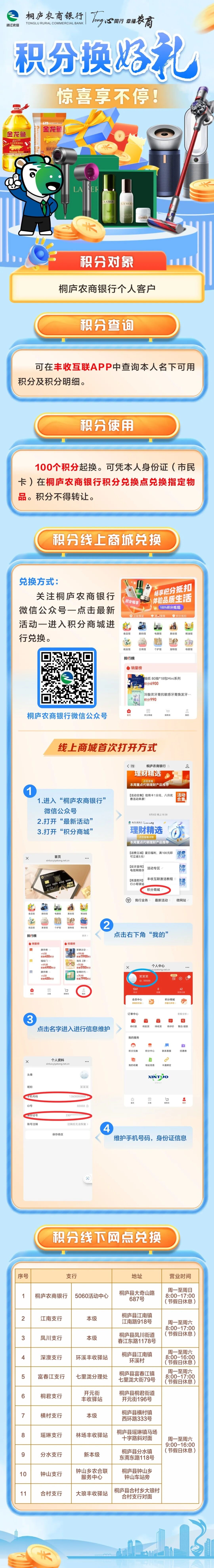 6 | 桐君支行 | 开元街丰收驿站 | 桐庐县桐君街道开元街196号 | 64218191 | 周一至周六,9:00-16:00 (节假日休息) |