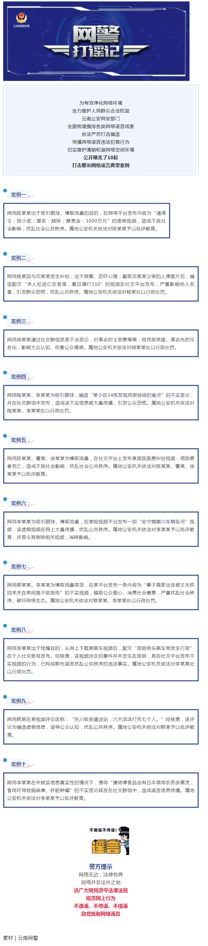 网警打谣|云南网安公布10起打击整治网络谣言典型案例