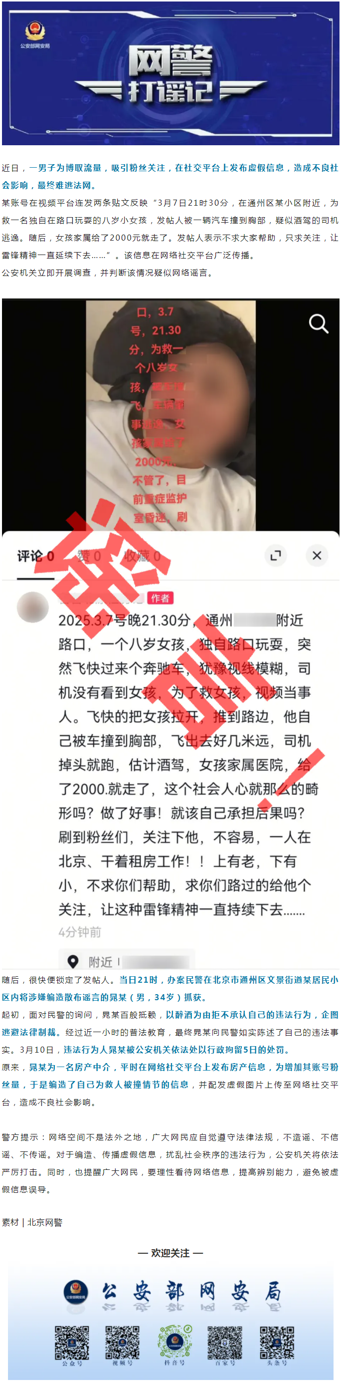 为涨粉,造谣“救人被撞”,一男子被拘!