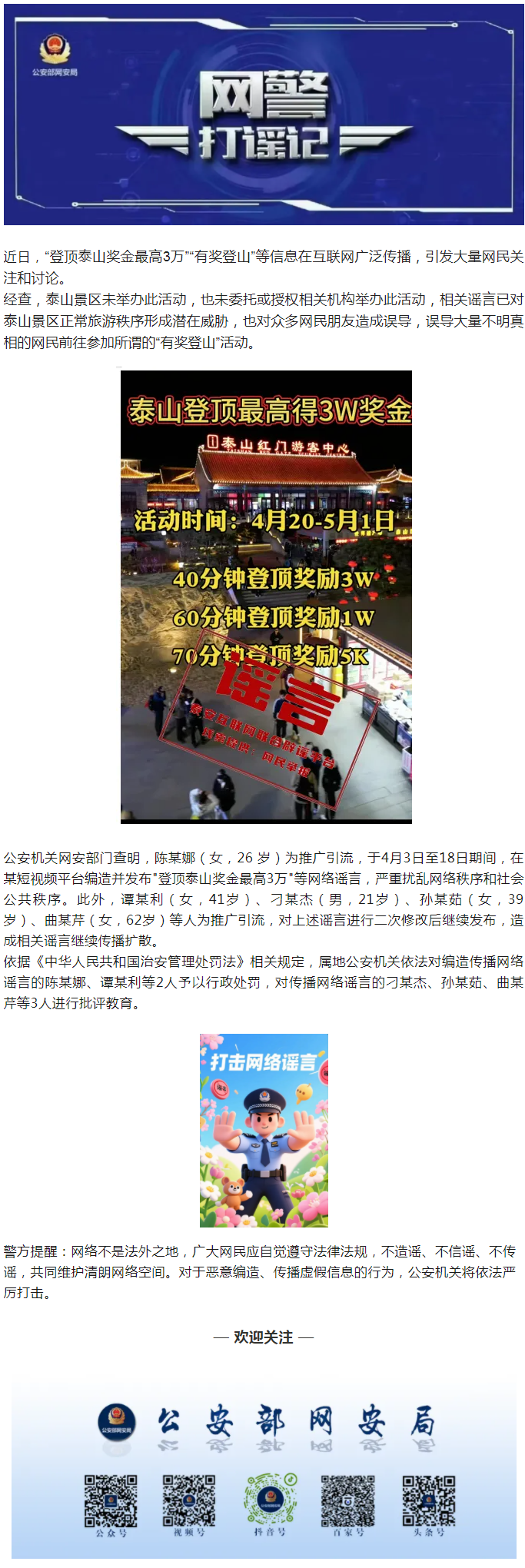 网警查处编造传播 “登顶泰山最高可得3万奖金”网络谣言者