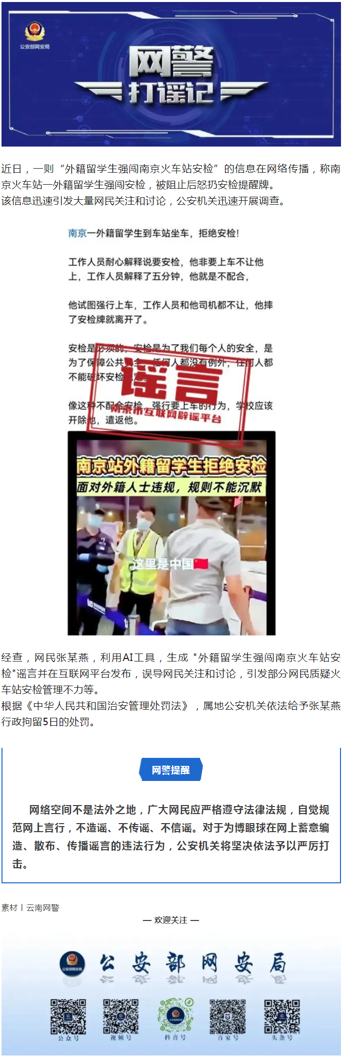利用AI工具捏造 "外籍留学生强闯南京火车站安检"网络谣言,张某燕被行政拘留