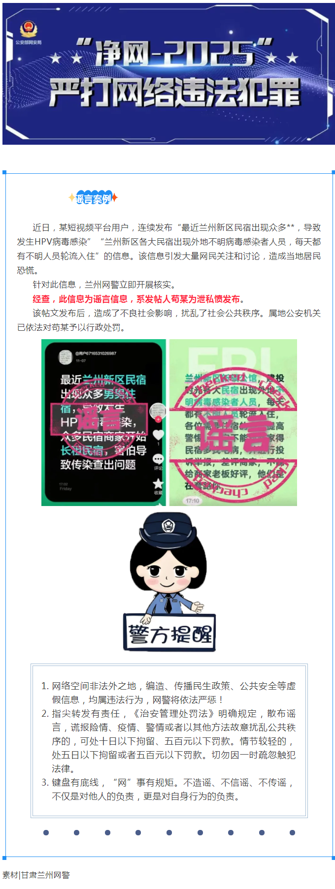 净网—2025|键盘有底线,“网”事有规矩!网警依法查处编造“民宿出现不明感染源”谣言者