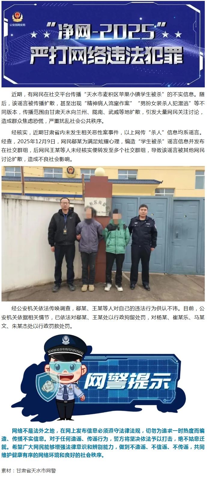 净网—2025丨编造传播“杀人”谣言,甘肃公安机关依法查处6名造谣者