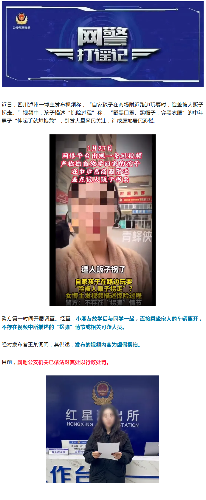 虚假摆拍“自家孩子险些被人贩子拐走”,王某被行政处罚